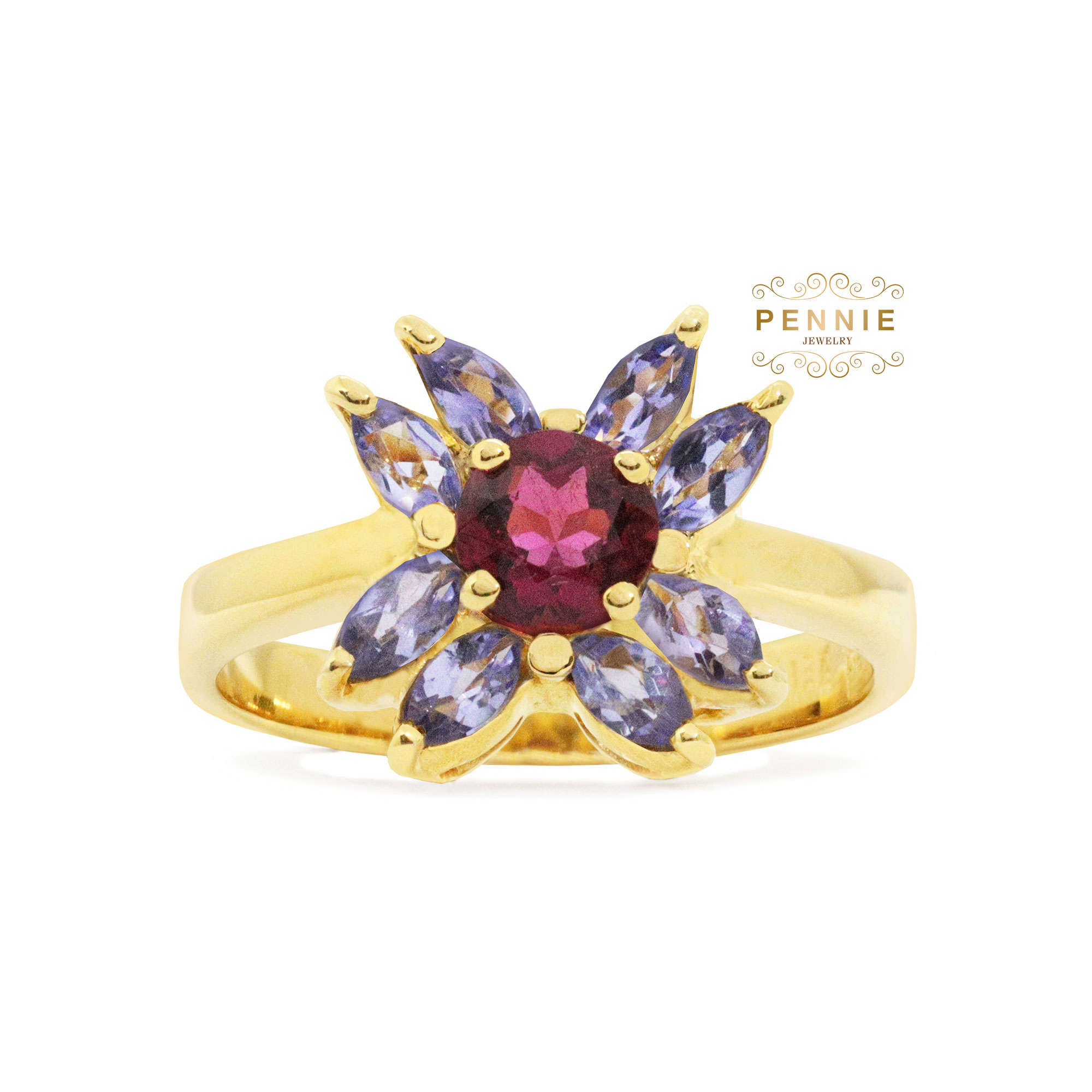 ทัวร์มาลีน(พลอยสีบานเย็น) น้ำหนัก0.42กะรัต แทนซาไนท์(พลอยสีม่วง)ทรงมาคี8เม็ด น้ำหนักรวม0.633กะรัต ตัวเรือนทอง18K น้ำหนัก4.5กรัม ไซส์แหวน53