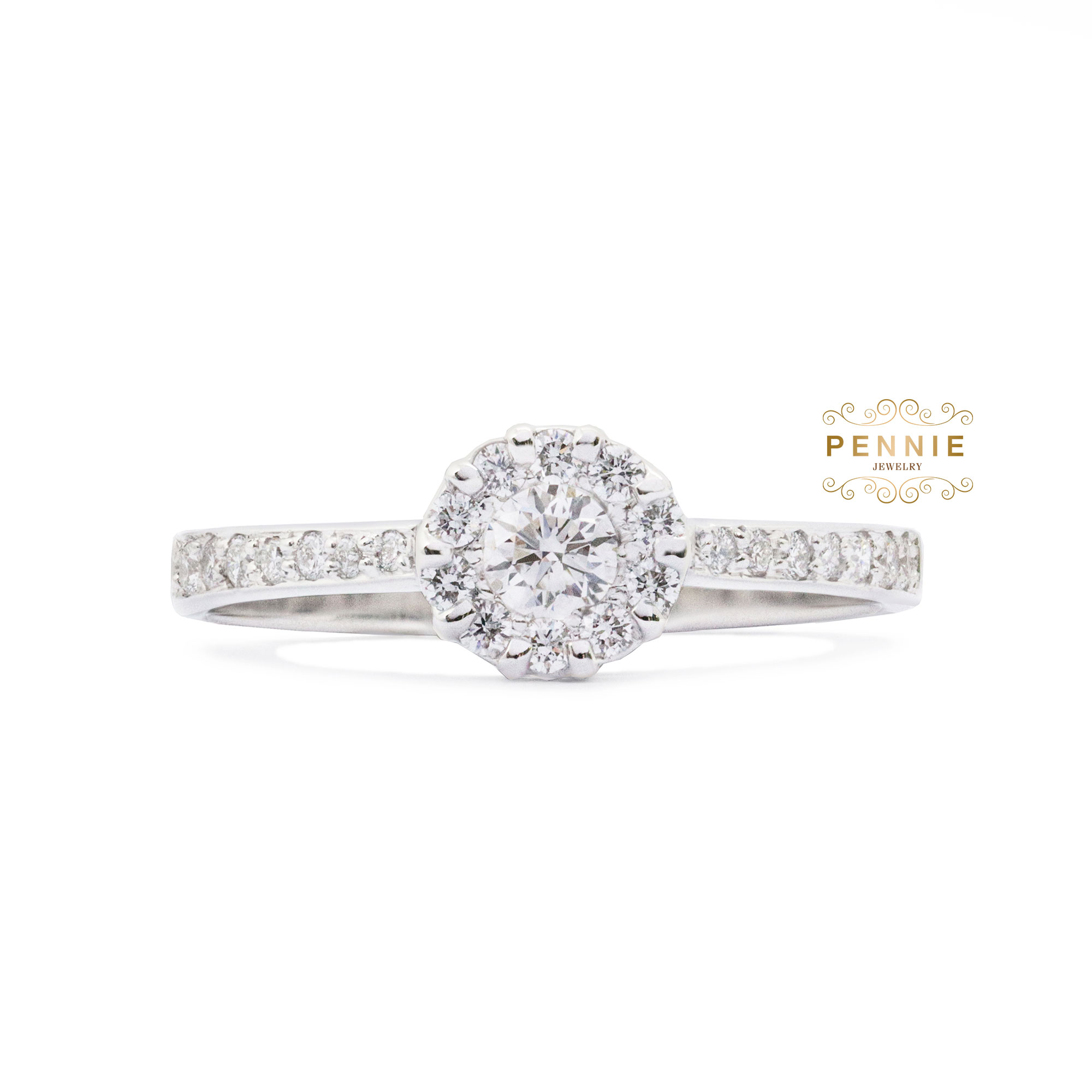 เพชรกลางน้ำหนัก0.12กะรัต เพชรล้อม10เม็ดน้ำหนักรวม0.078กะรัต เพชรขาแหวน14เม็ดน้ำหนักรวม0.09กะรัต ตัวเรือนทองขาว18Kน้ำหนัก2.48กรัม
