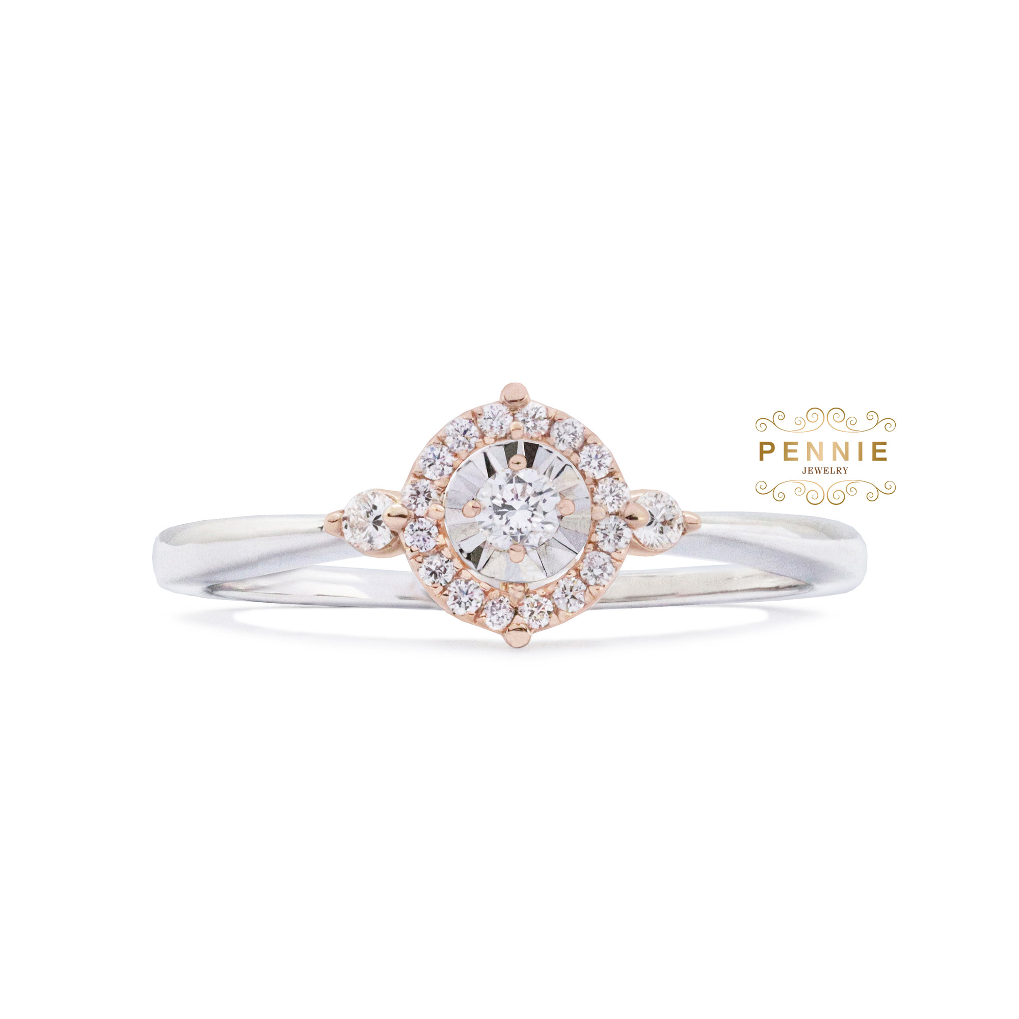 เพชรกลาง1เม็ดน้ำหนัก0.05กะรัต เพชรรอบ18เม็ดน้ำหนักรวม0.093กะรัต ตัวเรือนทองขาวและพิงค์โกลด์น้ำหนัก2.14กรัม