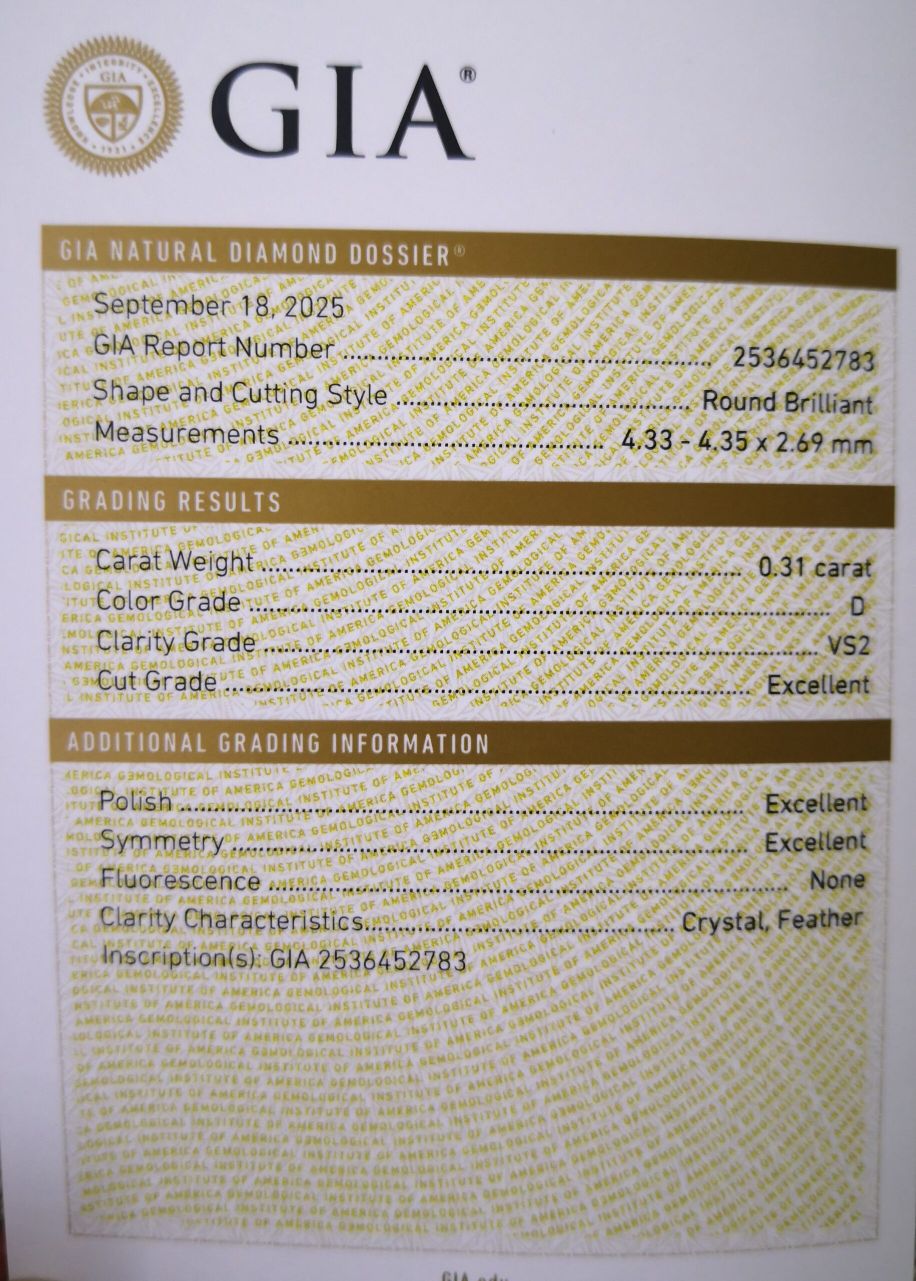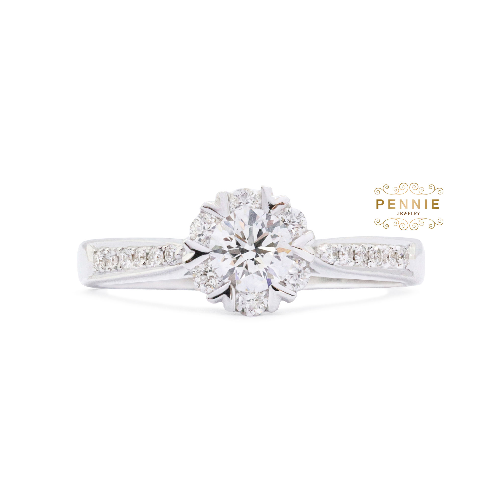 เพชรกลางน้ำ100(D Colour)น้ำหนัก0.31กะรัต ใบเซอร์GIA ความสะอาดVS2 เหลี่ยมเจียระไน3EX เพชรรอบ6เม็ดน้ำหนักรวม0.132กะรัต เพชรขาแหวน12เม็ดน้ำหนักรวม0.07กะรัต ตัวเรือนทองขาว18Kน้ำหนัก3.3กร้ม