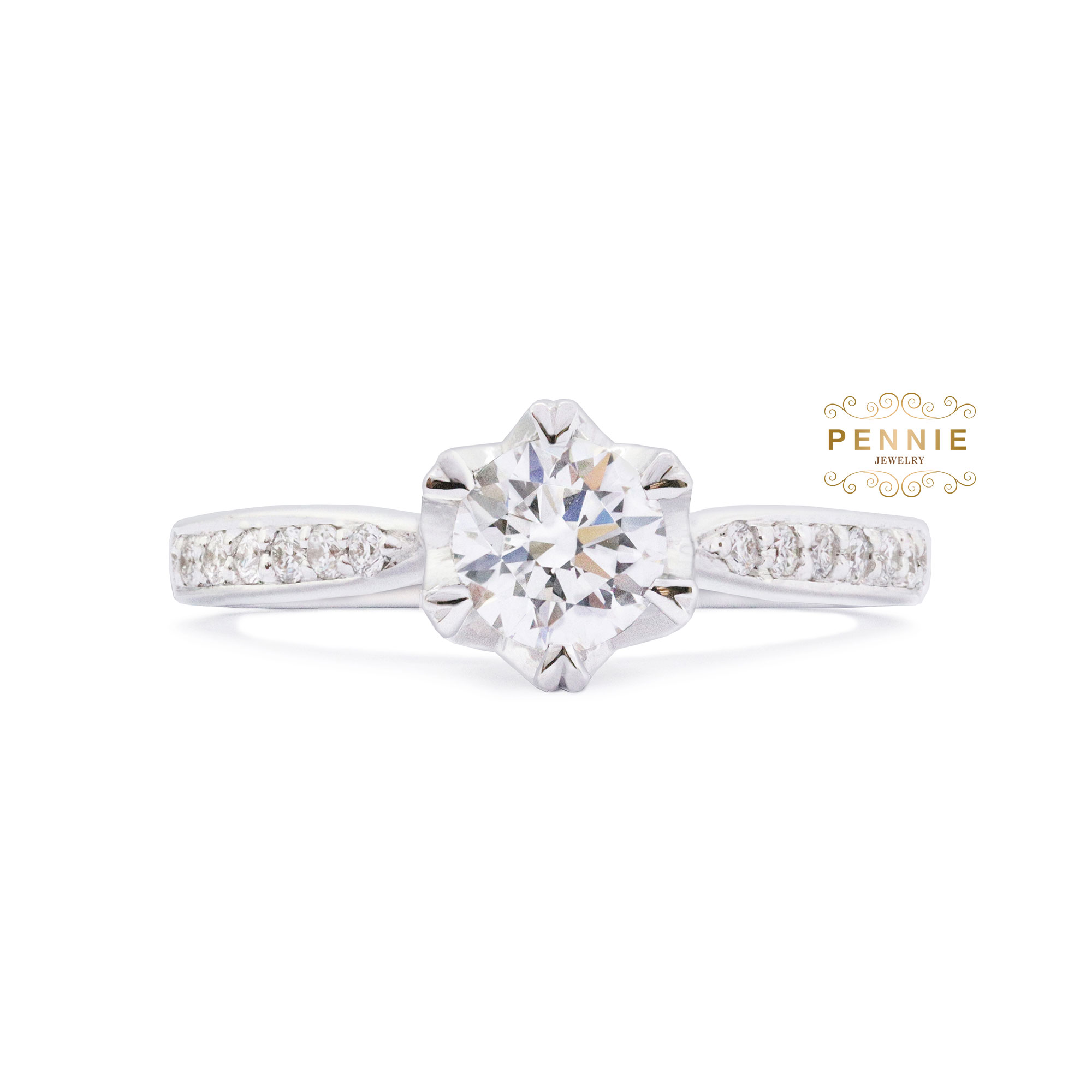 เพชรน้ำ100(D Colour)น้ำหนัก0.44กะรัต ใบเซอร์GIA ความสะอาดVS1 เหลี่ยมเจียระไน3EX เพชรขาแหวน14เม็ดน้ำหนักรวม0.143กะรัต เพชรด้านข้างขาแหวน20เม็ดน้ำหนักรวม0.078กะรัต ตัวเรือนทองขาว18Kน้ำหนัก3.3กรัม