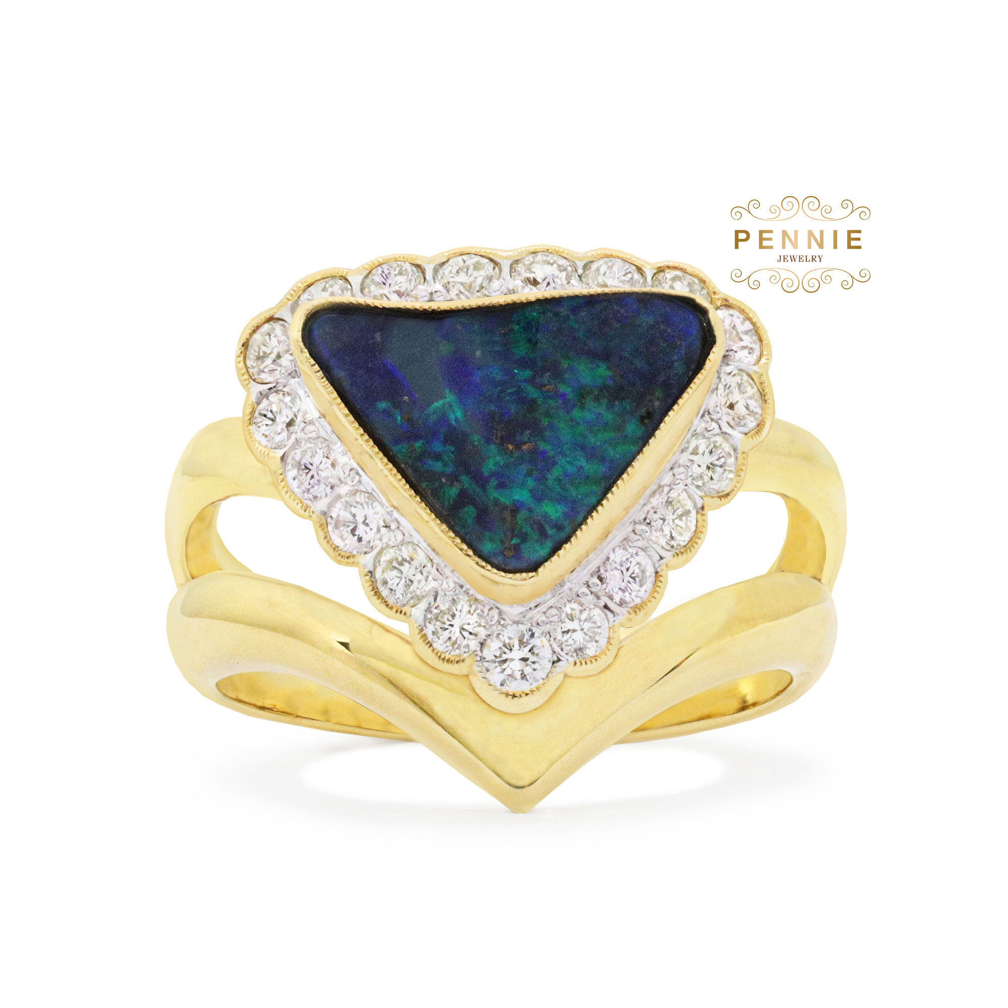 แบล็คโอปอล์รูปสามเหลี่ยม2.07กะรัต เพชร19เม็ดสี95(I color)น้ำหนักรวม0.508กะรัต ตัวเรือนทอง90%น้ำหนัก6.55กรัม ไซส์แหวน53